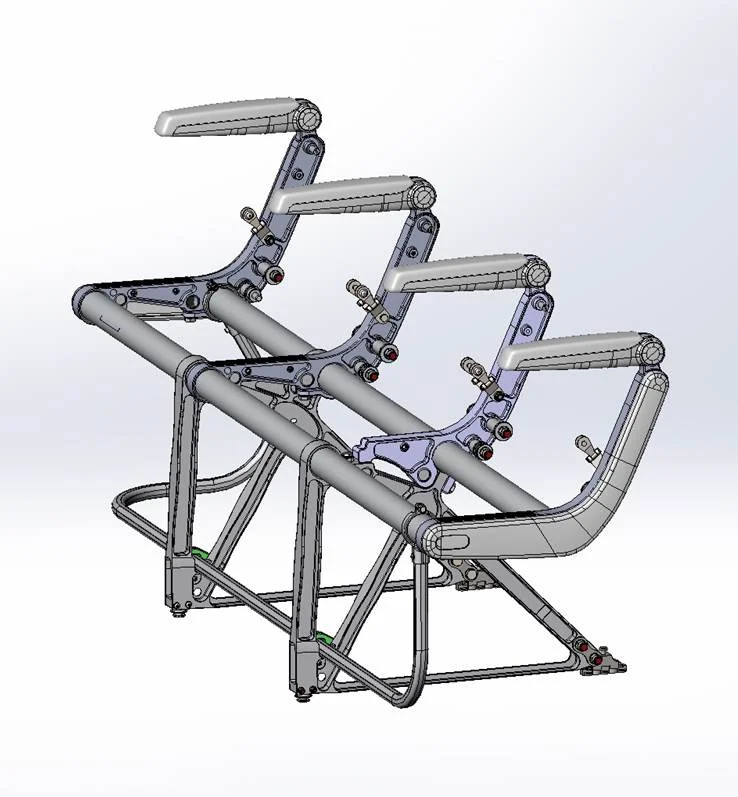 Blue Sky's architecture is entirely different. To create more knee and leg room, the aft beam was raised above knee level. This allowed us to exploit the space created by the lumbar curve of the spine. But to be able to stretch one's legs out and access under-seat space, the forward beam had to move downward to allow the seat pan to move to a lower position. An inclined slide could now move the seat pan forward and downward, taking with it a hinged internal back rest to fully support the spine - only possible if the seat is cantilevered. It now became possible to mount this mechanism within a fixed back shell that doesn't need to recline into the space of the passenger behind. By locking or unlocking the mechanism it is now possible, for the first time ever, to vary the ratio of premium to economy seats on any flight according to passenger demand, without physically changing the seat pitch, driving ancillary revenue.